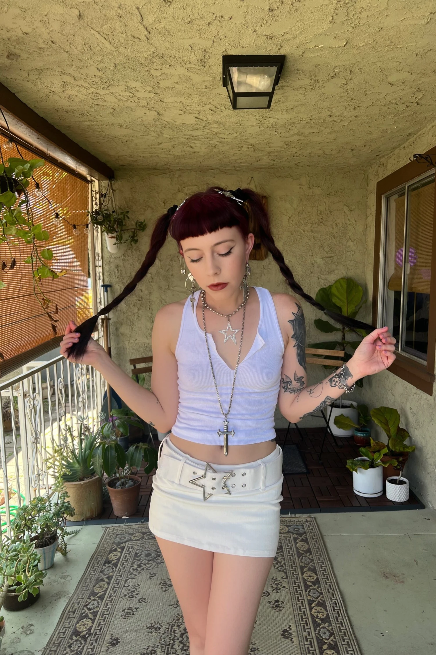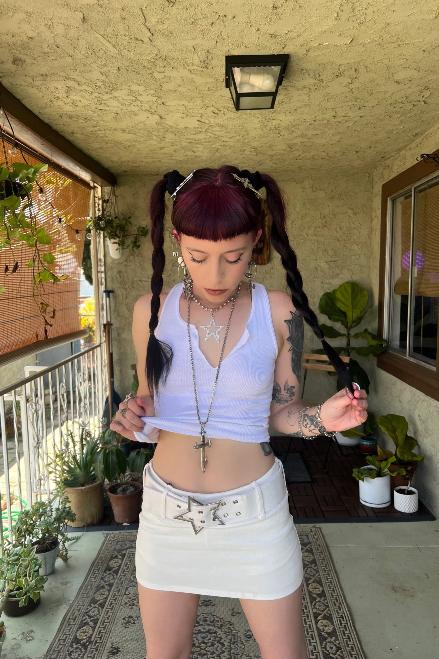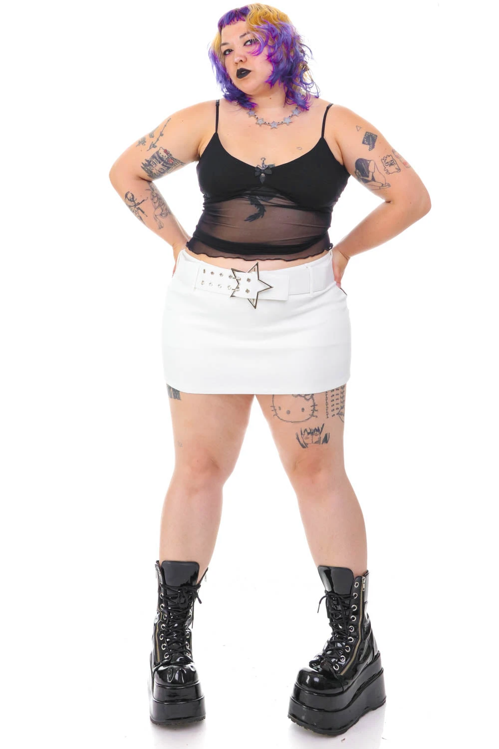 Low-rise stretch mini skirt with attached shorts underneath! Zipper at back plus detachable belt featuring metal star buckle!