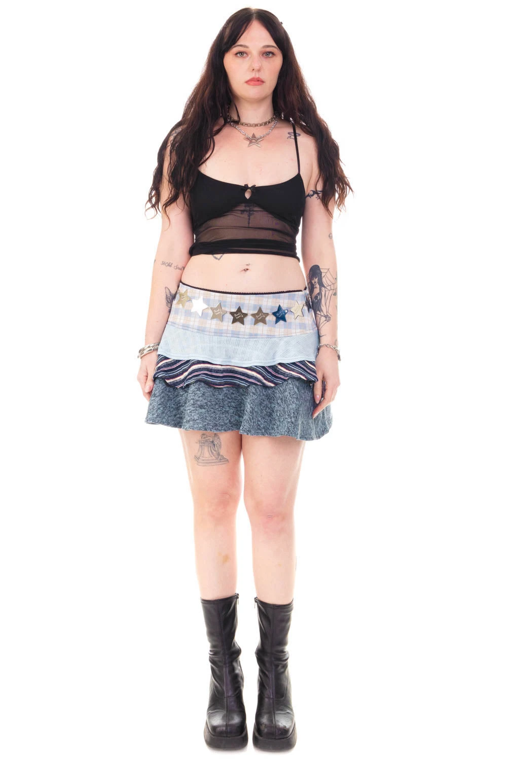 Low rise stretch mini skirt with layered ruffle tiers and scalloped elastic trim at waist!