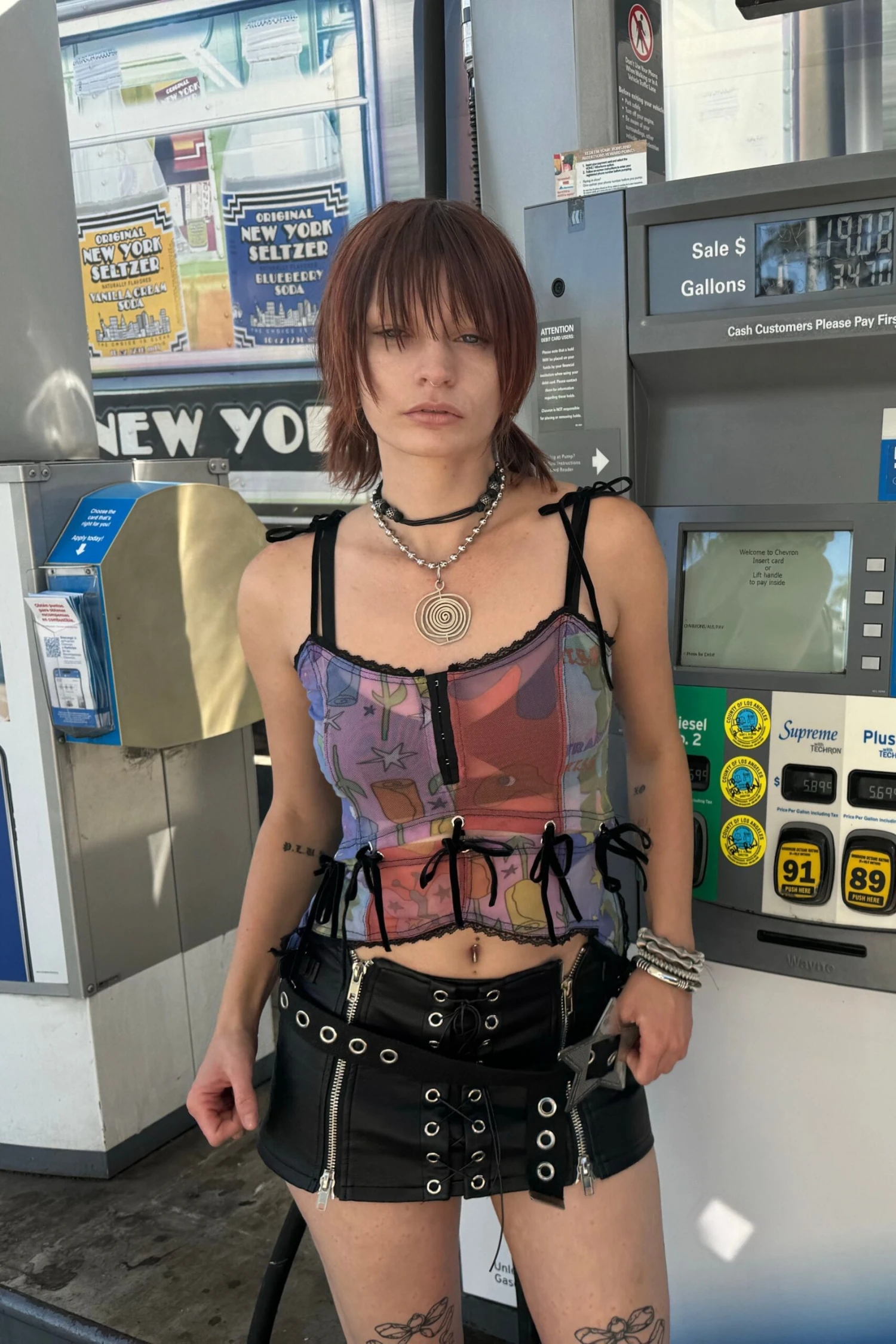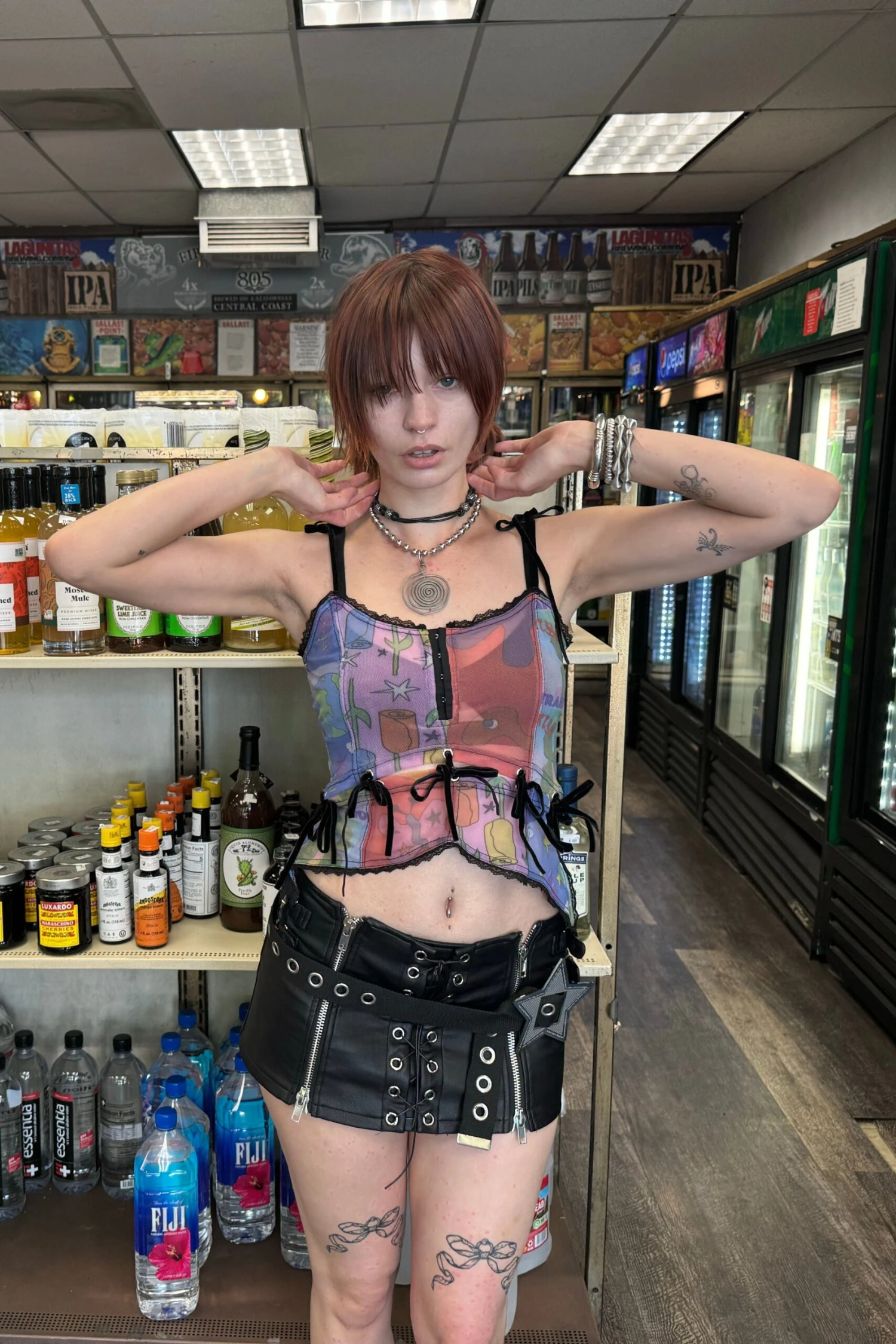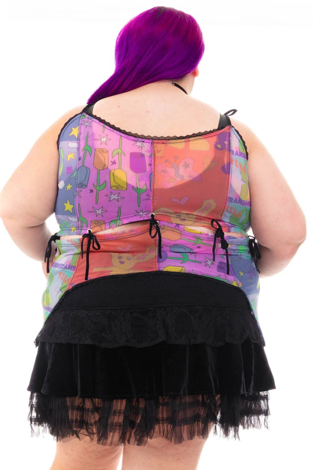 Printed mesh camisole with custom hand-drawn artwork! Velvet tie accents.