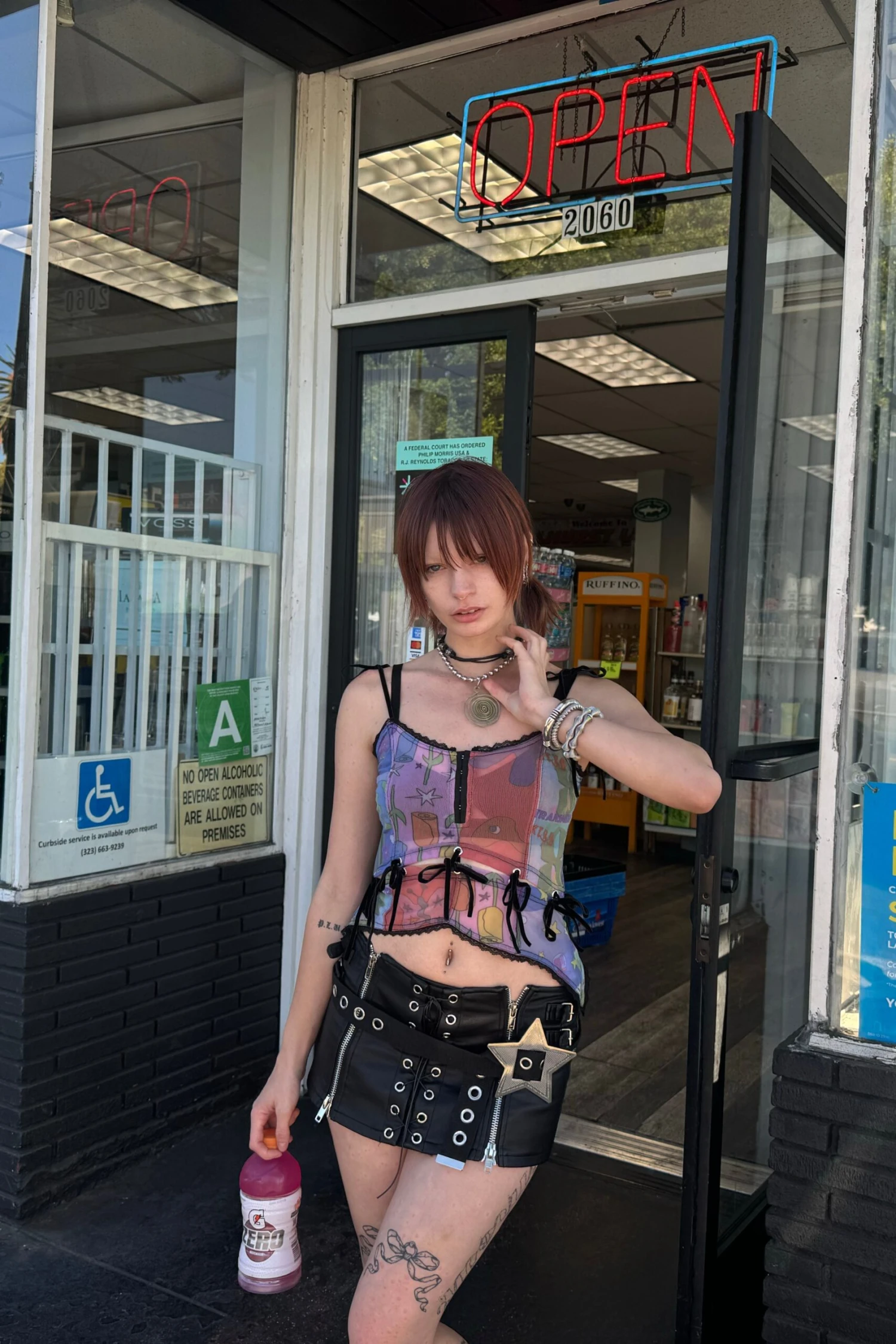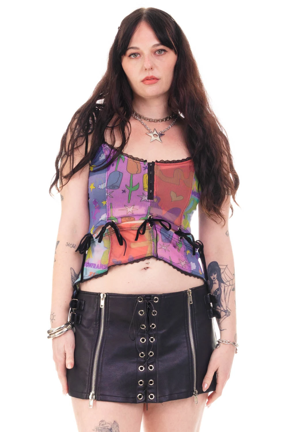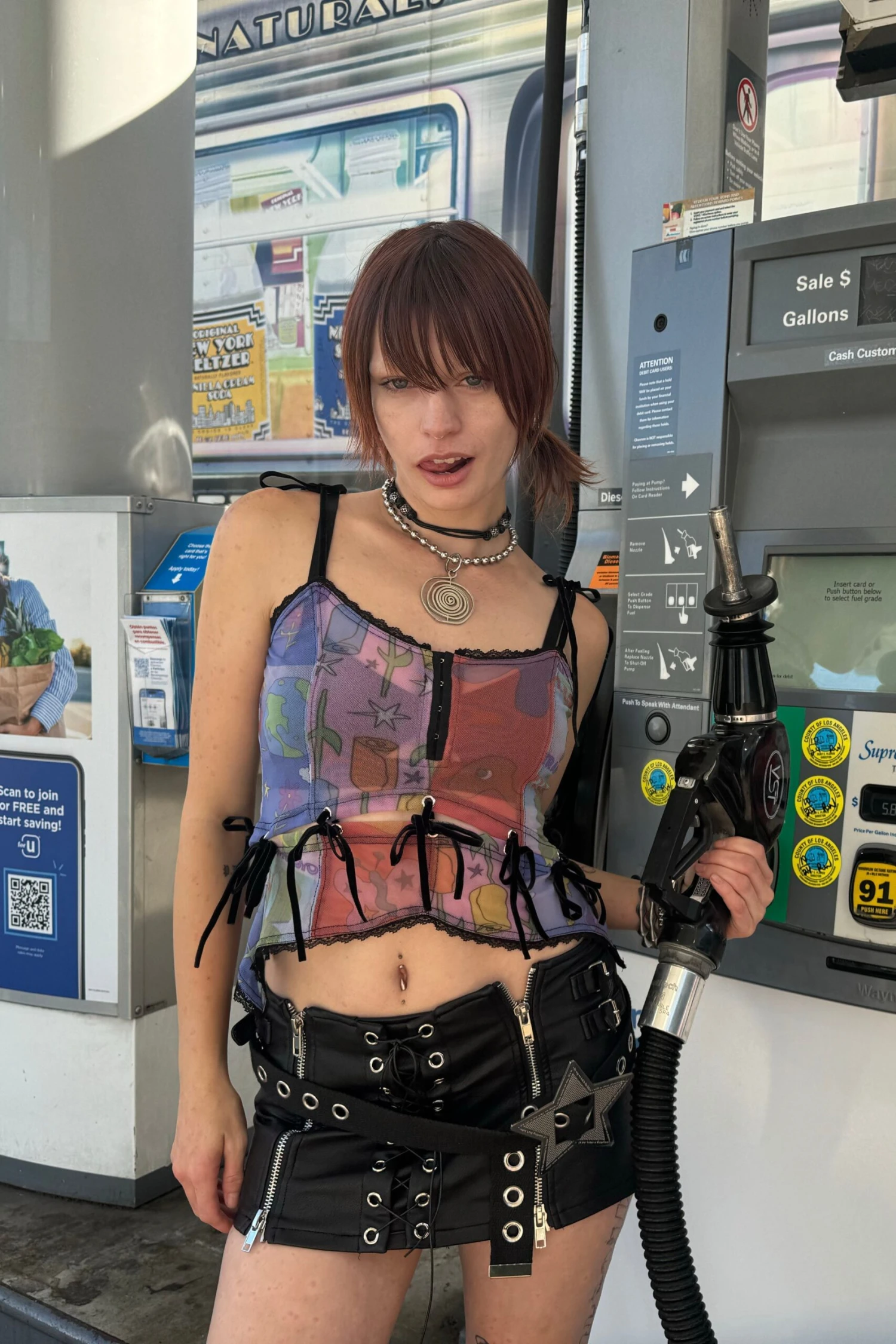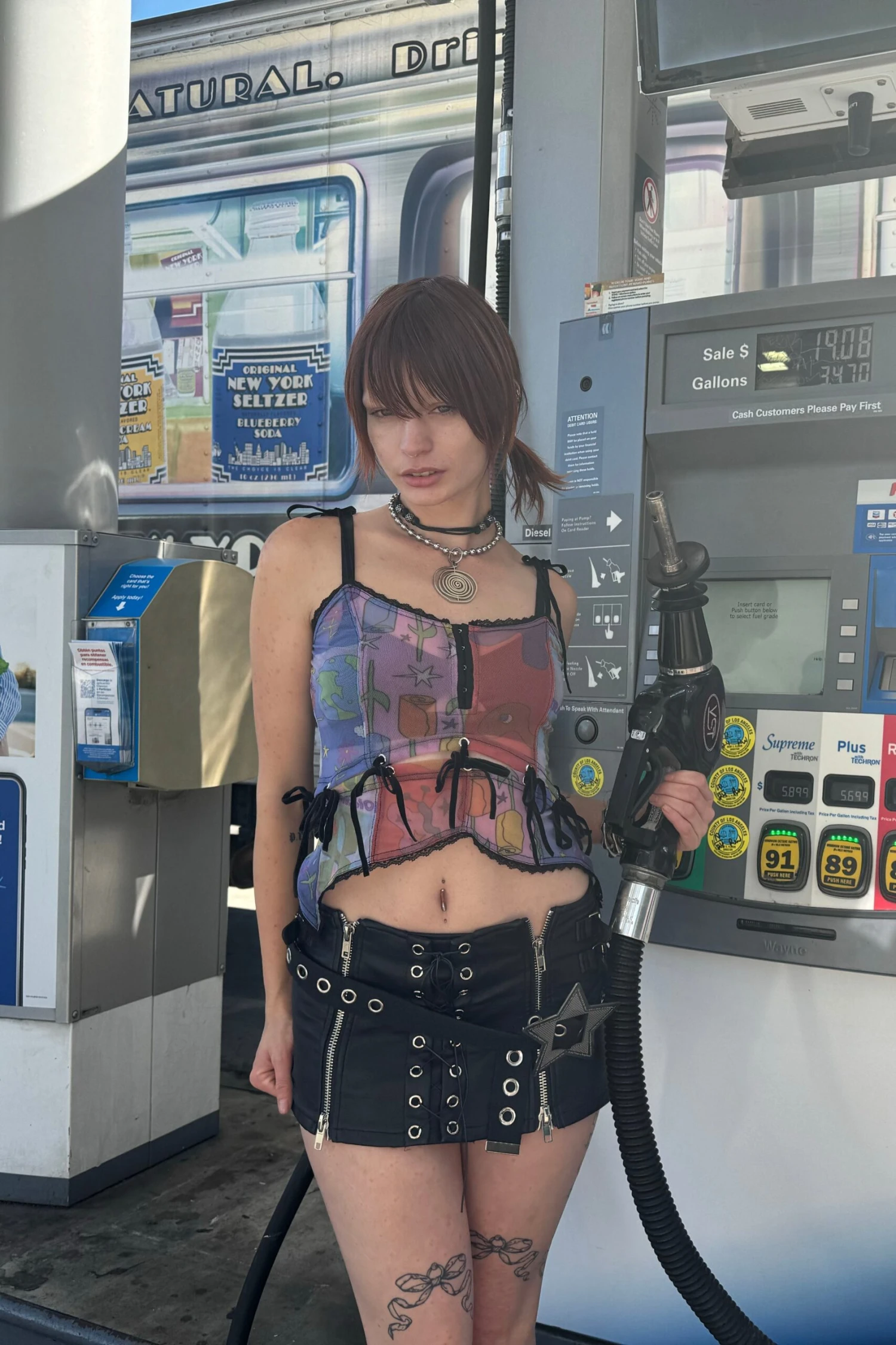 Printed mesh camisole with custom hand-drawn artwork! Velvet tie accents.