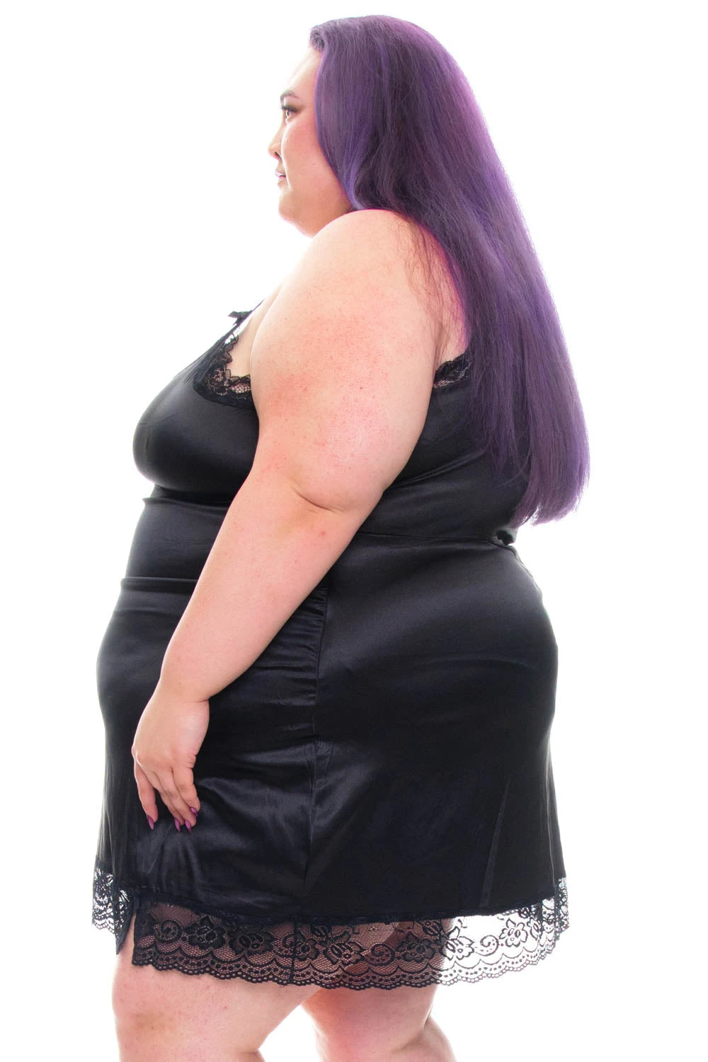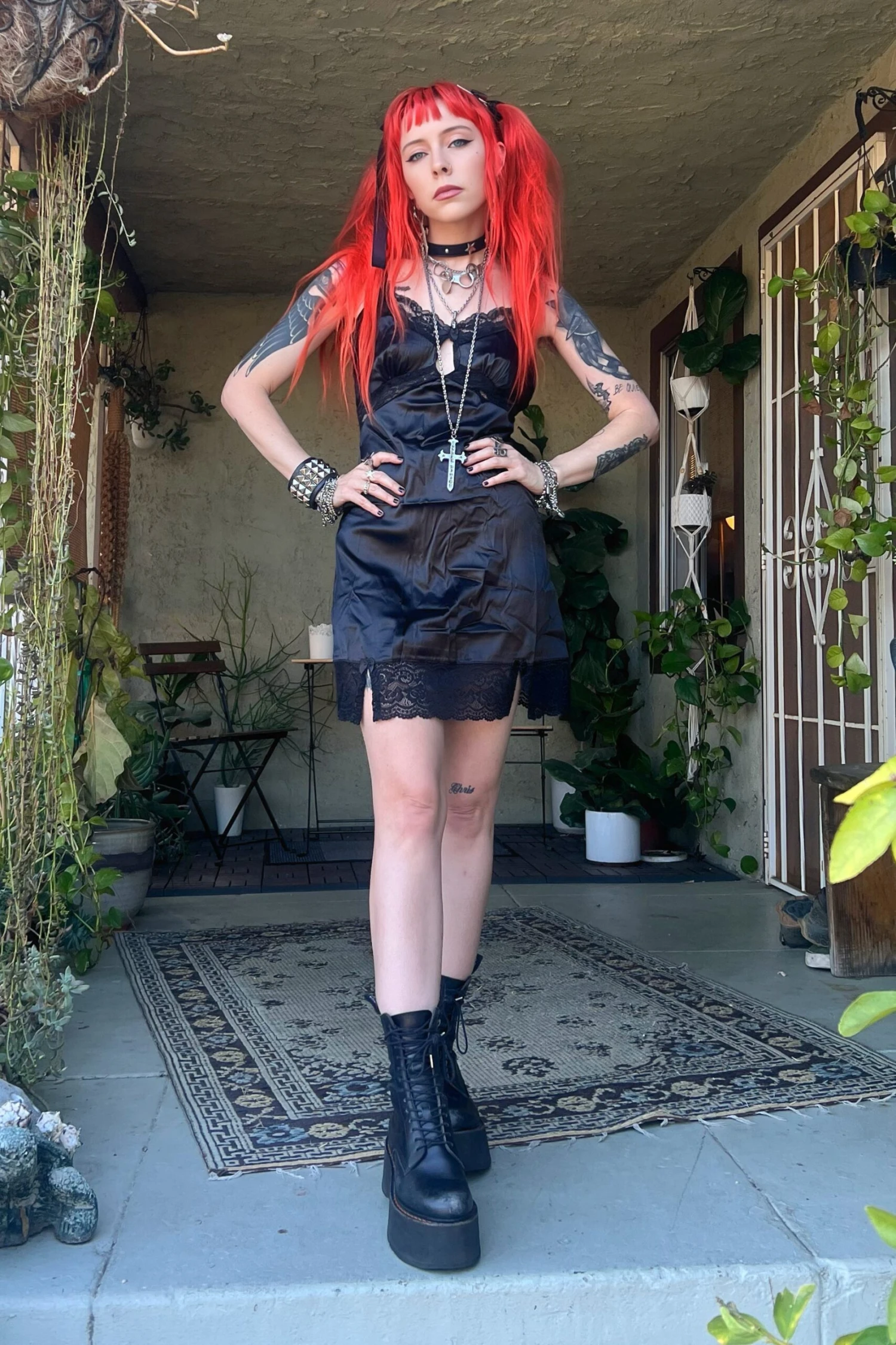 Black satin mini-length slip dress with black lace trim and little bow accents! Zipper closure at side, plus adjustable lingerie straps.