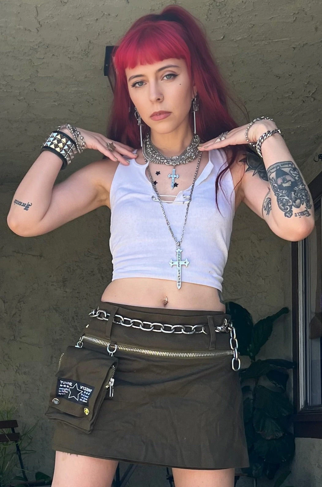 Olive twill mini skirt with detachable utility belt and pocket! Snap closure.