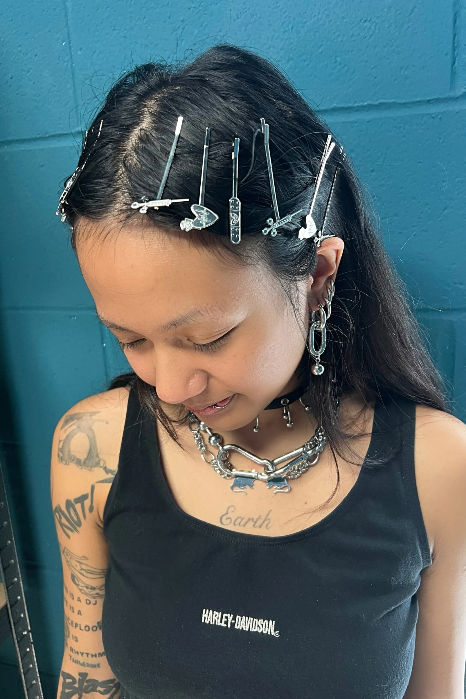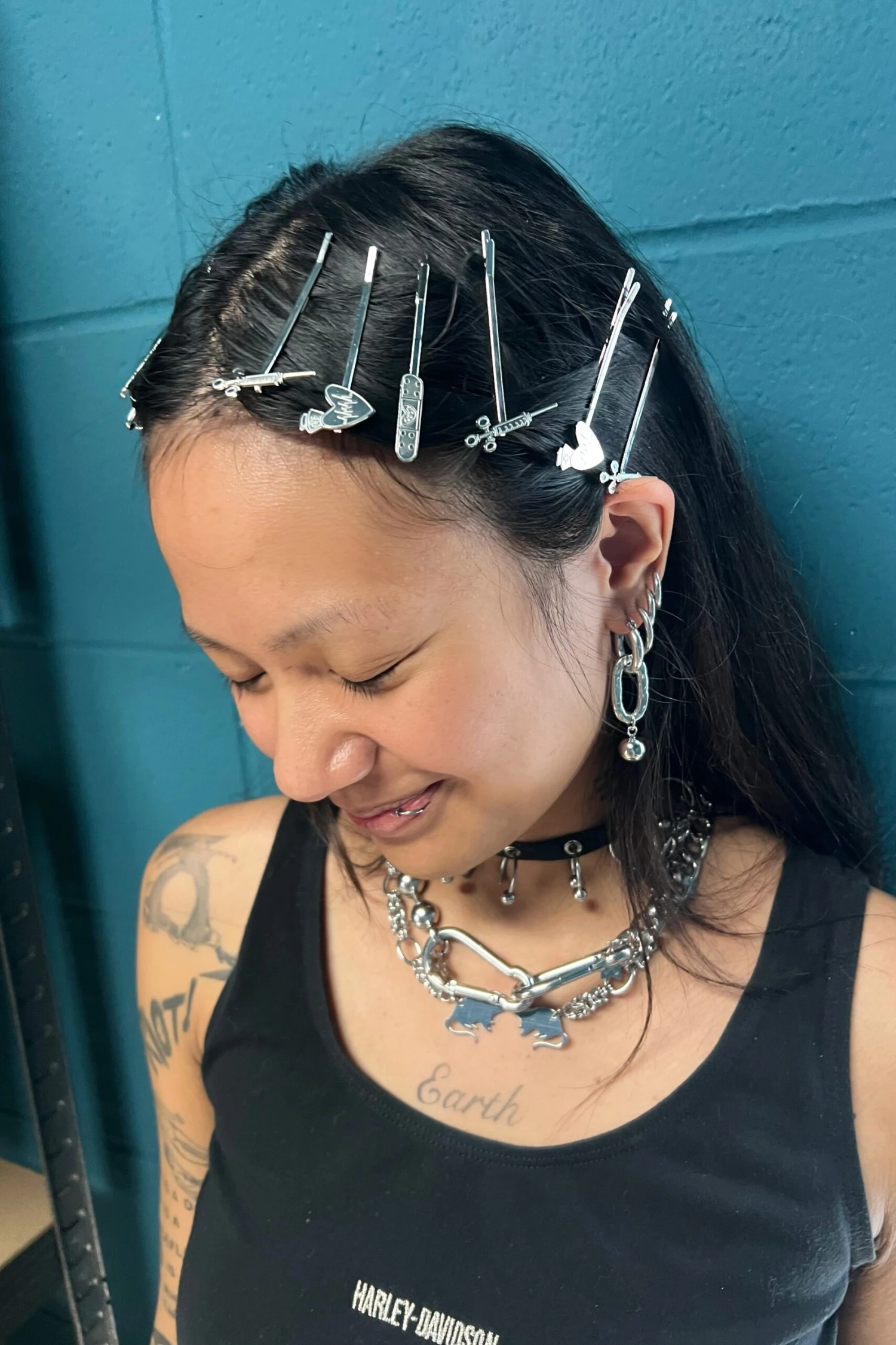 Stainless steel set of three bobby pins with syringe, bandaid, and heart line icons!