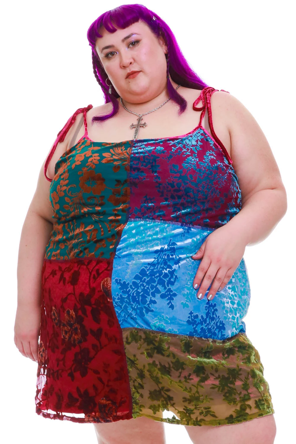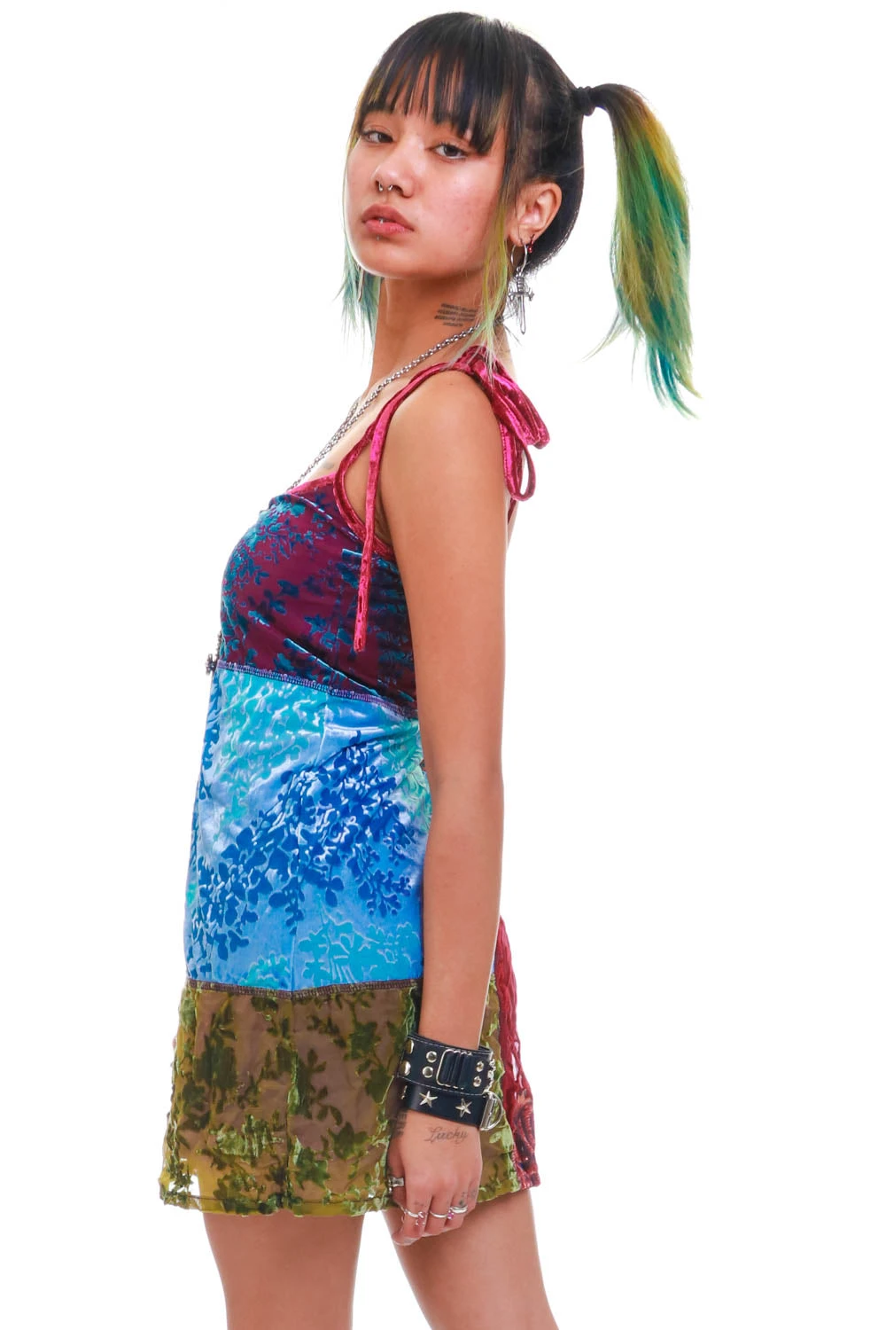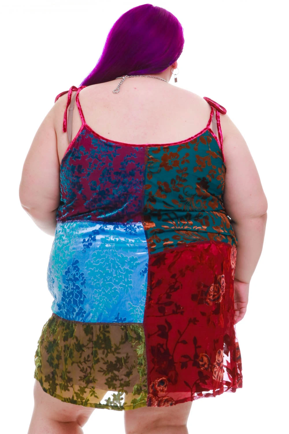 Swing mini dress with patchwork panels! Plus attached lining and adjustable tie straps.
