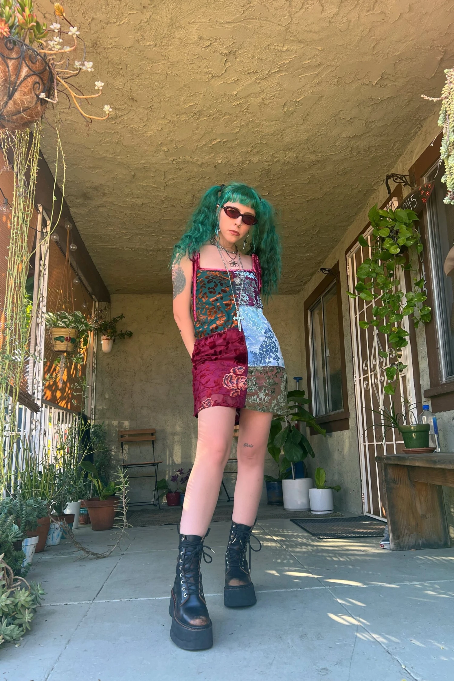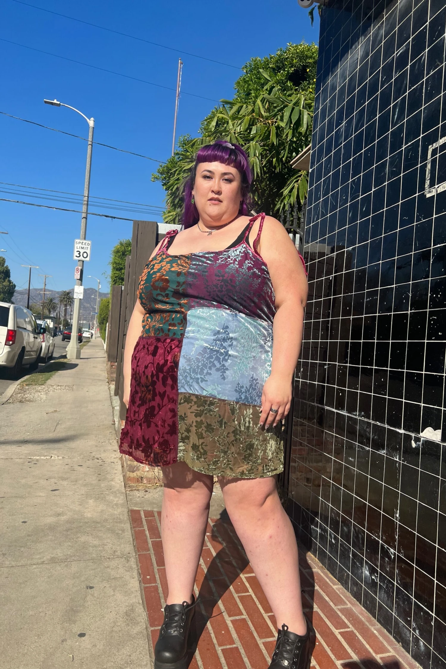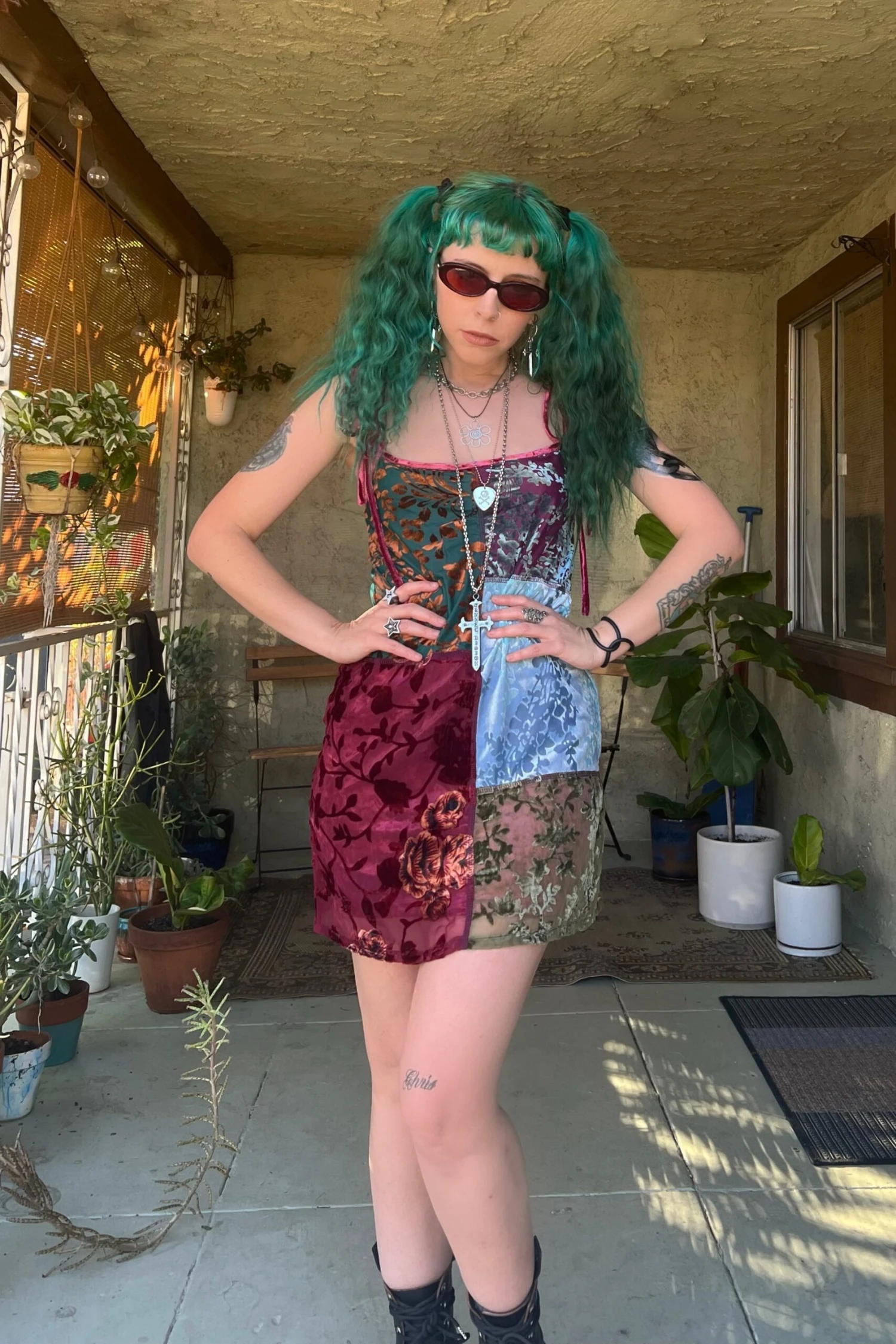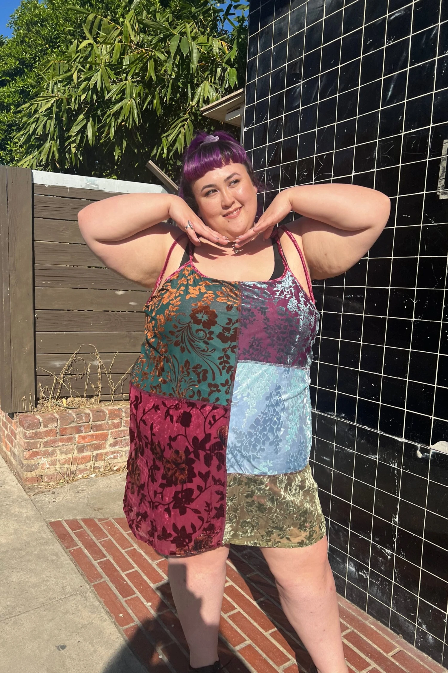 Swing mini dress with patchwork panels! Plus attached lining and adjustable tie straps.