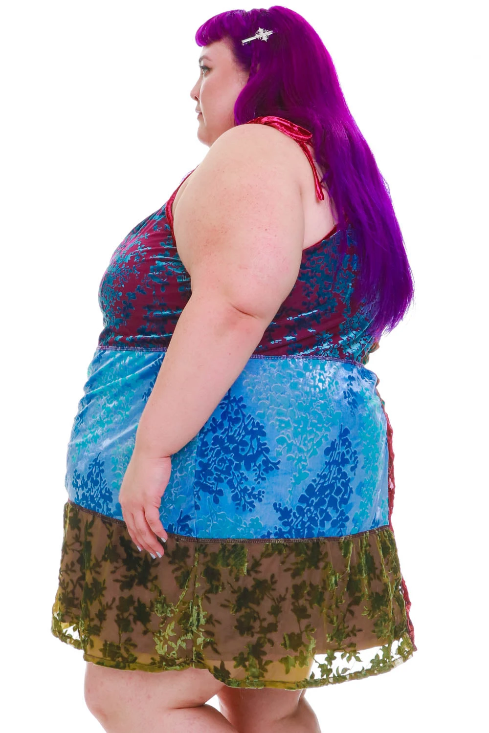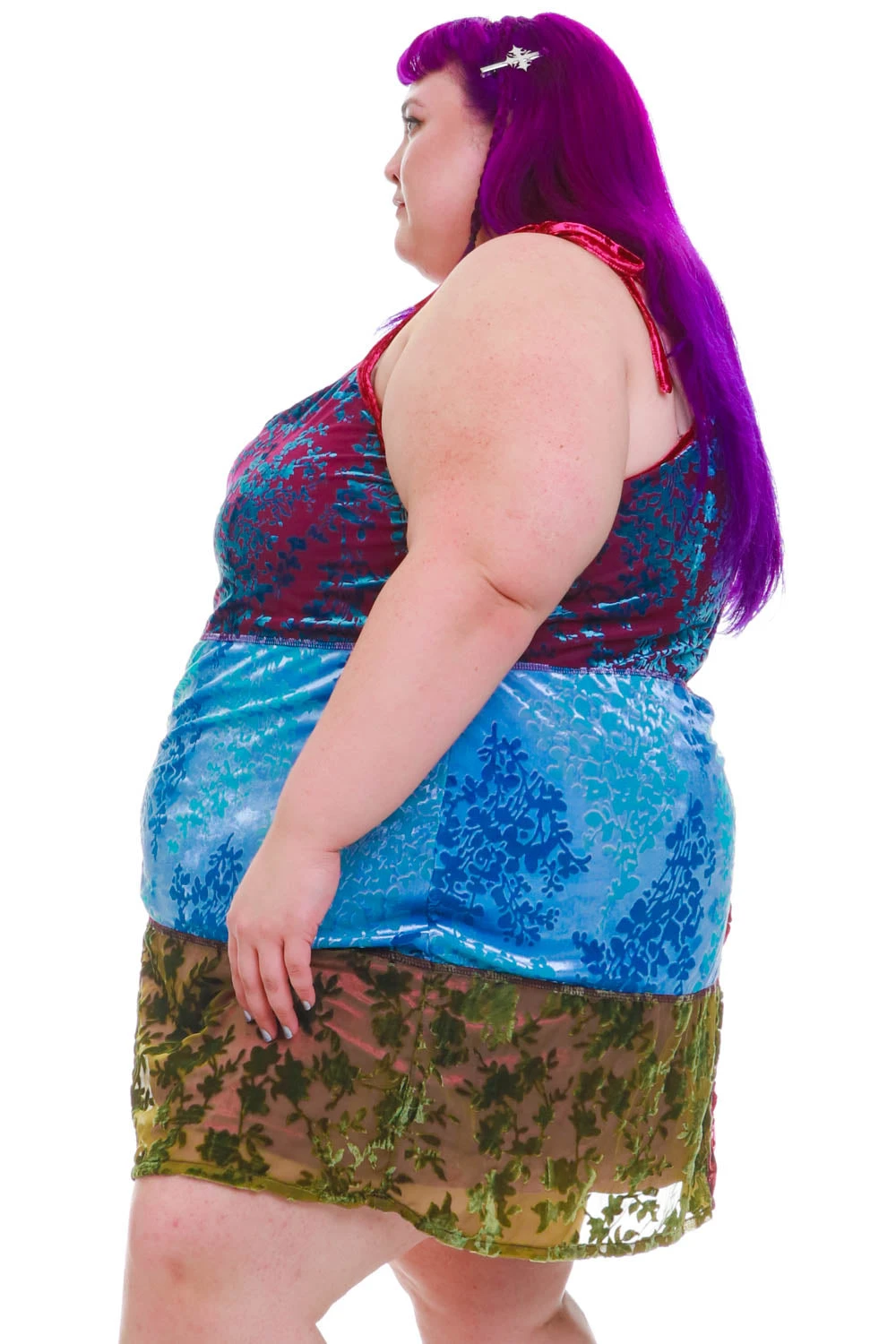 Our model Aya is 5’5” with 54” waist, 58” bust, and 65” hip; she usually wears a size 4X/5X and is pictured in a size 5X.