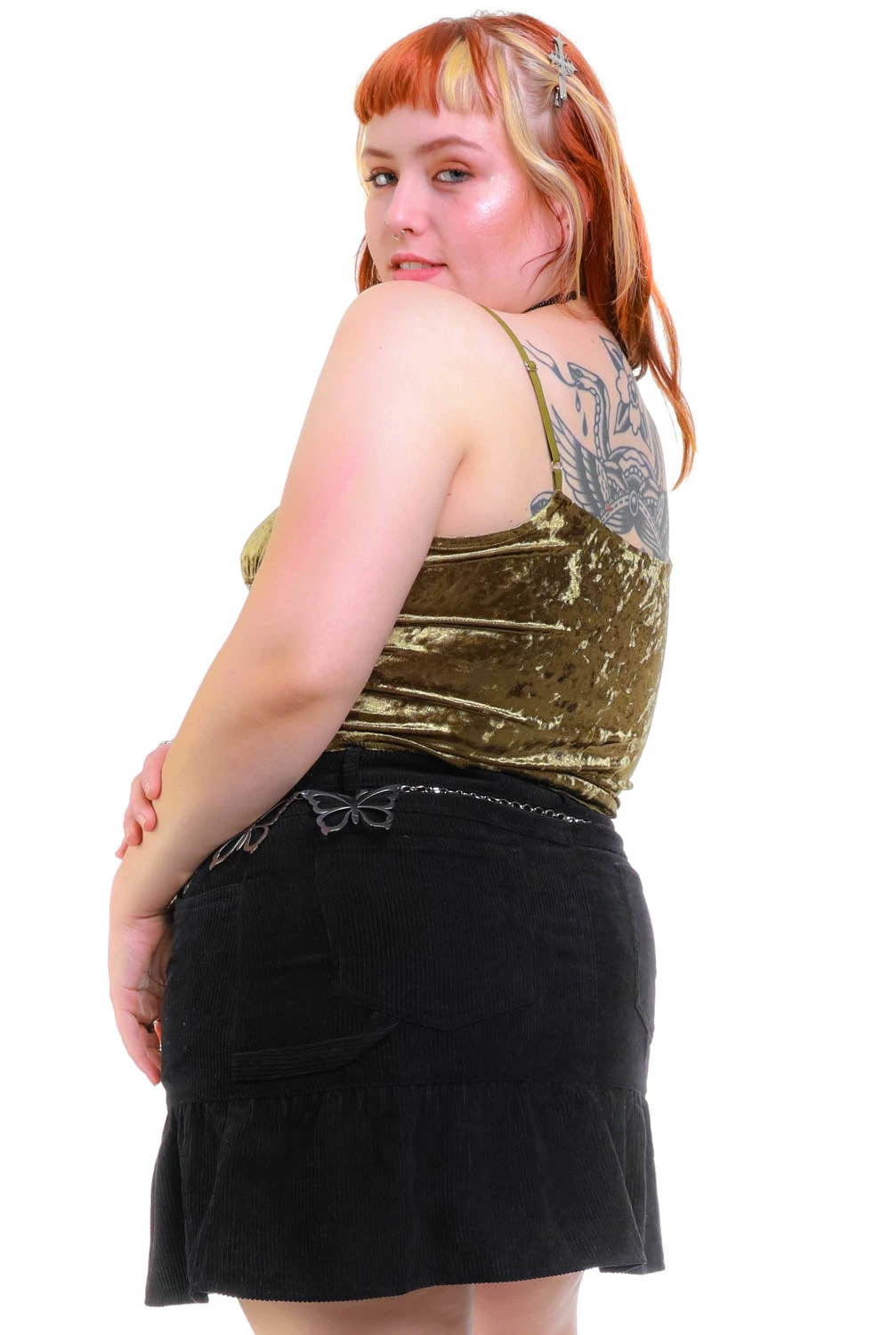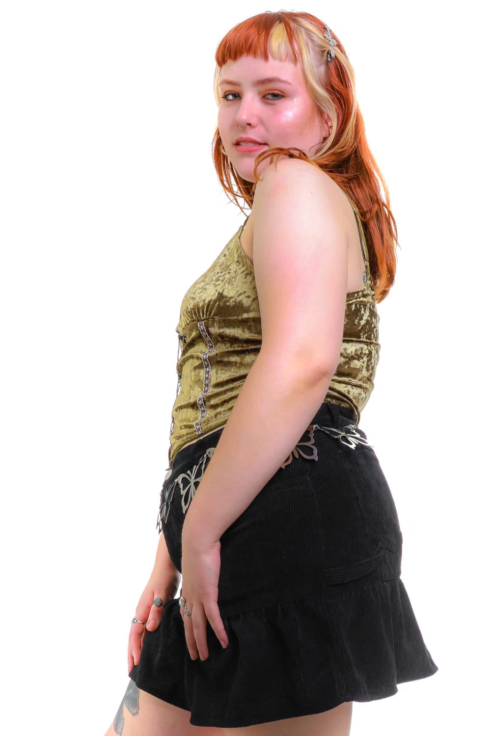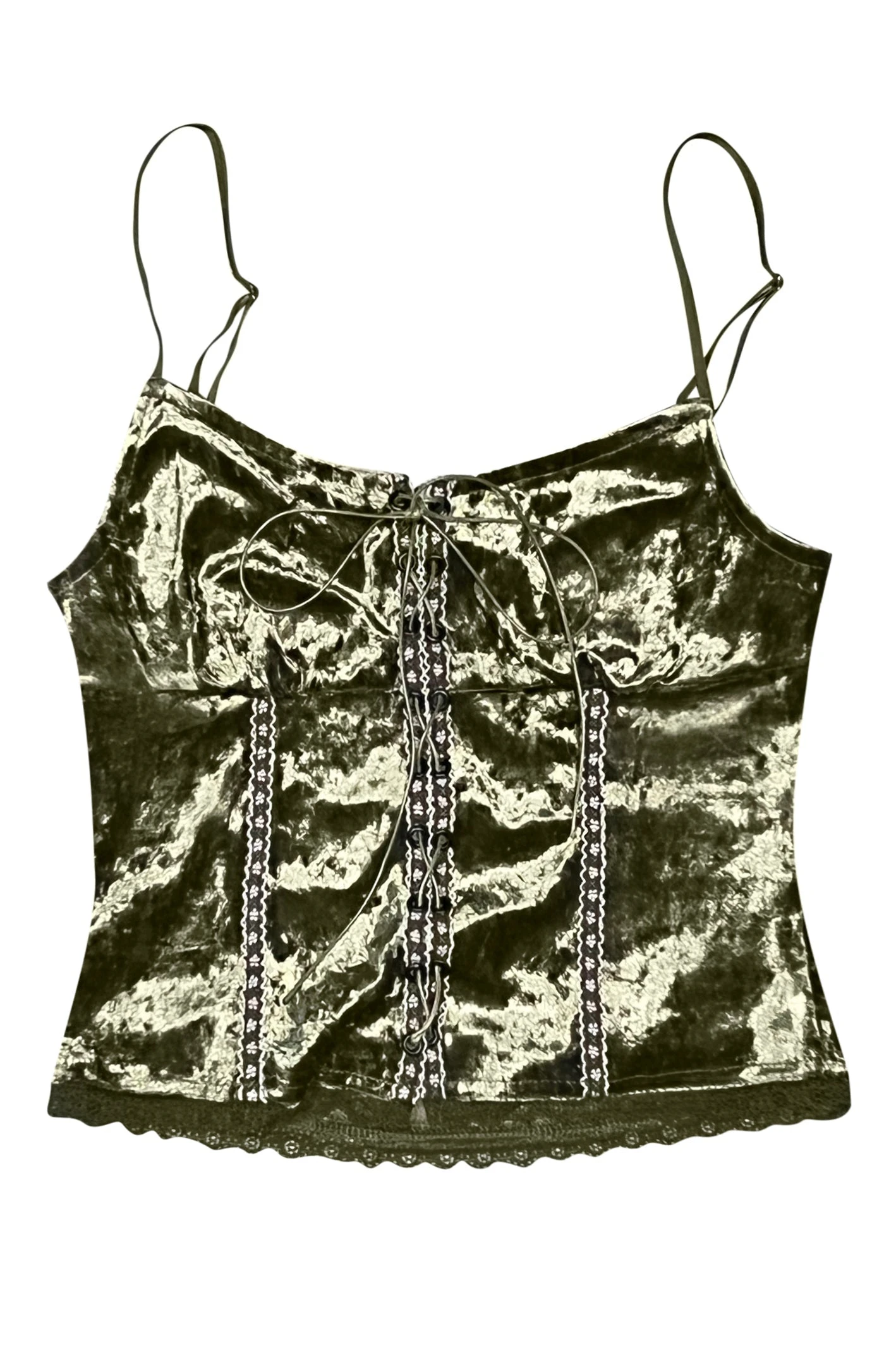 Velvet stretch camisole with adjustable straps, ribbon trim, and lace-up front.