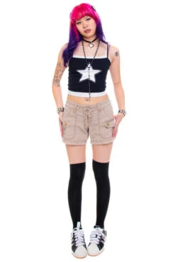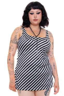 Our model Tehya is 5’5” with 27″ waist, 36” hips, and 35” chest and usually wears size Small/Medium. This item was not pinned on her and would best a size Small or Medium.