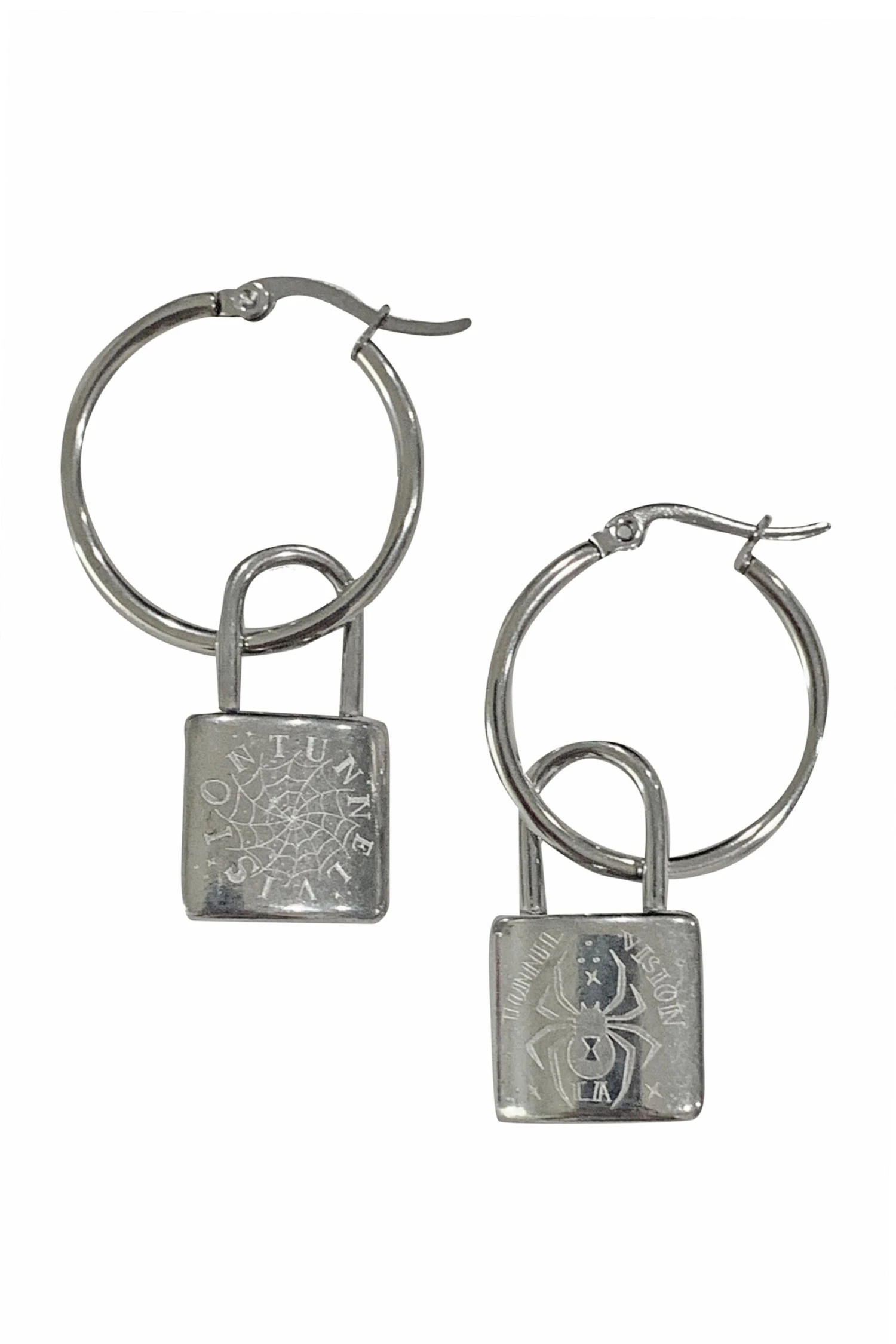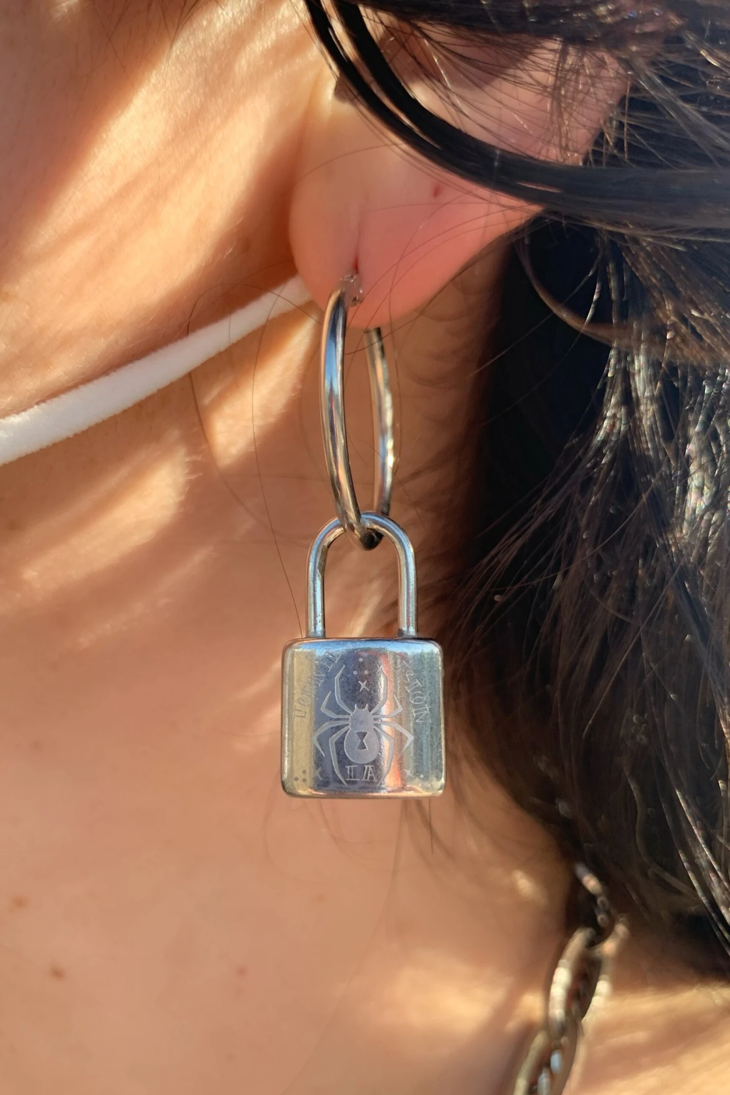Set of 2 stainless steel charm earrings on 1″ stainless steel hoops! Lock charms are engraved with our signature black widow art on one side and spiral web on the other.